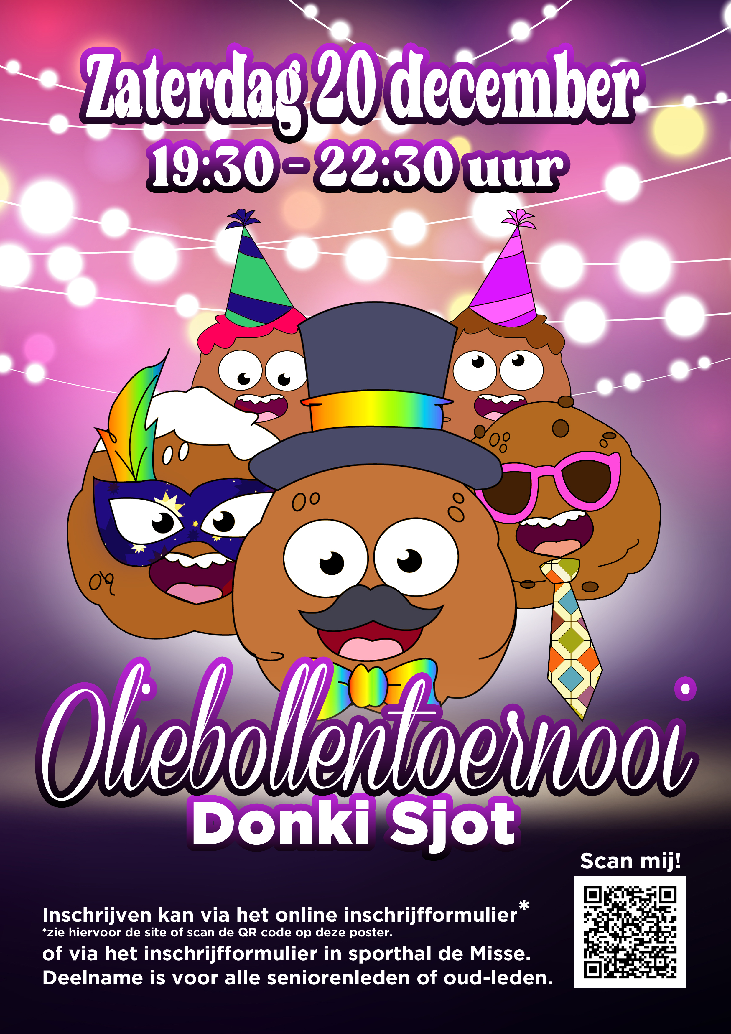 Inschrijven voor het toernooi kan via deze link: https://www.cognitoforms.com/DonkiSjot/AanmeldFormulierOliebollentoernooi of via de inschrijflijst in sporthal de Misse.